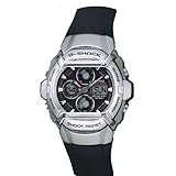 Powerfully styled with a modern silver resin case, this Casio G-Shock analog/digital men's watch (model G511-1AV) can withstand virtually any punishment you can mete out. It features a black dial and luminous hands as well as three digital subdial windows (for the watch's sport timing features) and an additional digital window displaying day of the week. This large, round case measures 44.5mm wide (or 1.75 inches), and it's completed by a black resin strap that tapers as it winds around your wrist.